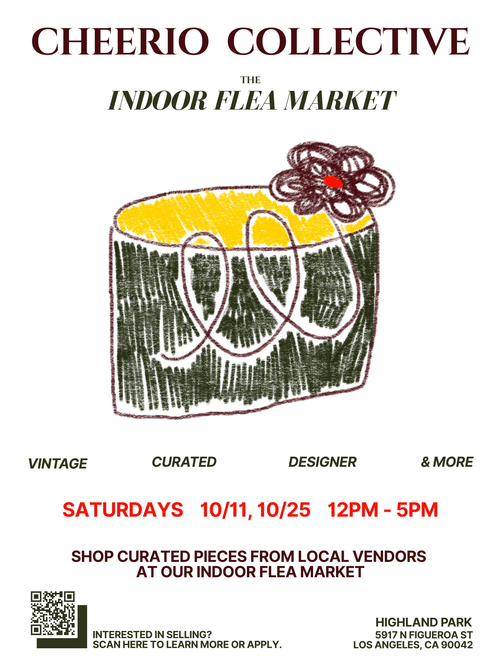 Cheerio Indoor Flea Market 10/25 Saturday, October 25, 2025 12:00 PM 5:00 PM Cheerio Collective 5917 N Figueroa St Los Angeles, CA, 90042 USA (map) Google Calendar ICS