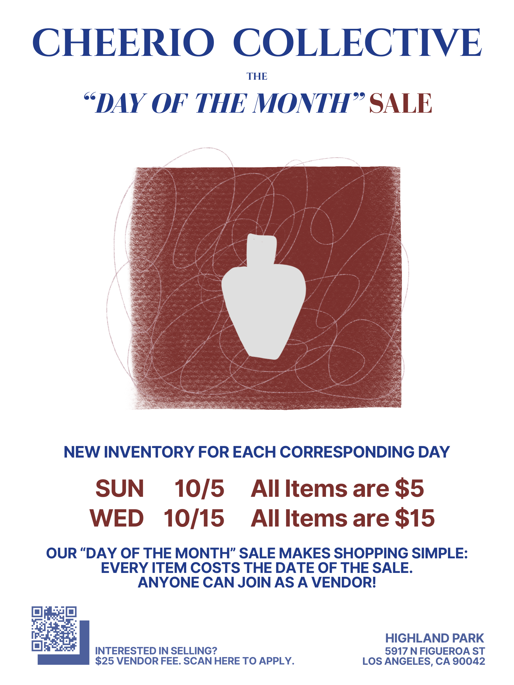 Day of the Month Sale - $15 on 10/15 Wednesday, October 15, 2025 12:00 PM 6:00 PM Cheerio Collective 5917 N Figueroa St Los Angeles, CA, 90042 USA (map) Google Calendar ICS
